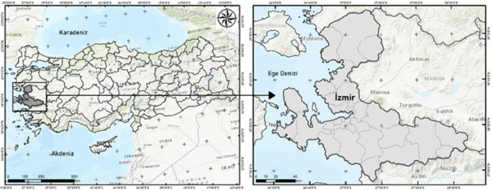 The study is being conducted in Izmir, a province in the Aegean Region of Türkiye, covering an area of 11,891 km². With a population of 4.4 million and a population density of 372 people/km², İzmir is Turkey's third most populous city. Due to its favorable climate, natural and cultural resources, and developed industries in agriculture, tourism, and services, Izmir is a major attraction. As the third most migratory city in Türkiye, Izmir faces rapid population growth and urbanization, leading to significant land use changes. These changes impact the ecosystem services provided by the city's resources and present challenges to ecological conservation, especially in urban and rural areas. Izmir's 30 districts show varied distribution in terms of population density, natural resources, and urban functions. Some districts are highly urbanized, while others, dominated by agriculture, maintain a rural character.